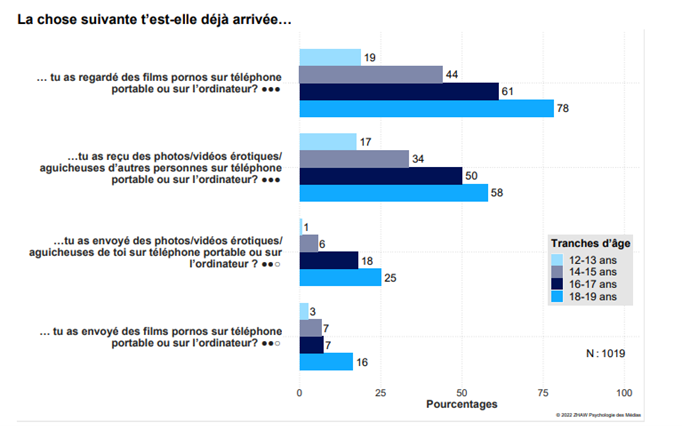 Sur ces sites, il est souvent difficile de garantir l’âge des personnes présentes dans les vidéos ou les images, ce qui augmente le risque de présence de matériel pornographique impliquant des mineurs. Et il est encore plus difficile de contrôler qui visionne le contenu mis en ligne. En comparaison avec les rapports JAMES des années précédentes, le pourcentage de jeunes qui affirment avoir regardé du porno s’accroit. En effet, d’après les résultats de l’étude JAMES 2022 menée sur un échantillon de plus de 1000 jeunes, environ 53% des jeunes Suisses ont déjà regardé du contenu pornographique5Külling, C., Waller, G., Suter, L., Williemse, I., Bernath, J., Skirgaila, P., Streule, P., Süss, D., & Swisscom SA. 2022. ZHAW – Departement Angewandte Psychologie. JAMES, 2022. Disponible à l’adresse : https://www.zhaw.ch/storage/psychologie/upload/forschung/medienpsychologie/james/2018/Raport_JAMES_2022_fr.pdf., alors qu’entre 2014 et 2020 ce chiffre variait entre 41 et 44%6James-studie. Zhaw Angewandte Psychologie [en ligne]. [Consulté le 13 juillet 2023]. Disponible à l’adresse : https://www.zhaw.ch/de/psychologie/forschung/medienpsychologie/mediennutzung/james/#c77096..