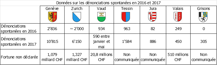 En revanche, selon les déclarations des cantons à l’agence ATS8Le Temps, 16 janvier 2018 modifié le 10 juin 2023, Les auto-dénonciations au fisc explosent dans plusieurs cantons, https://www.letemps.ch/economie/autodenonciations-fisc-explosent-plusieurs-cantons?srsltid=AfmBOopVlgMmbjqQ-hv5vjxXfwTn1rNkgIPXrSYzE5fsPZYNrITy3xNY (consulté le 27 juillet 2025)., les dénonciations spontanées ont augmenté de manière exponentielle en 2016 et 2017 soit avant l’entrée en vigueur de l’EAR. Ainsi, les cantons de Genève, et du Jura ont vu leur nombre multiplié par environ 3 et 10 respectivement.