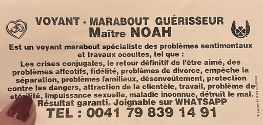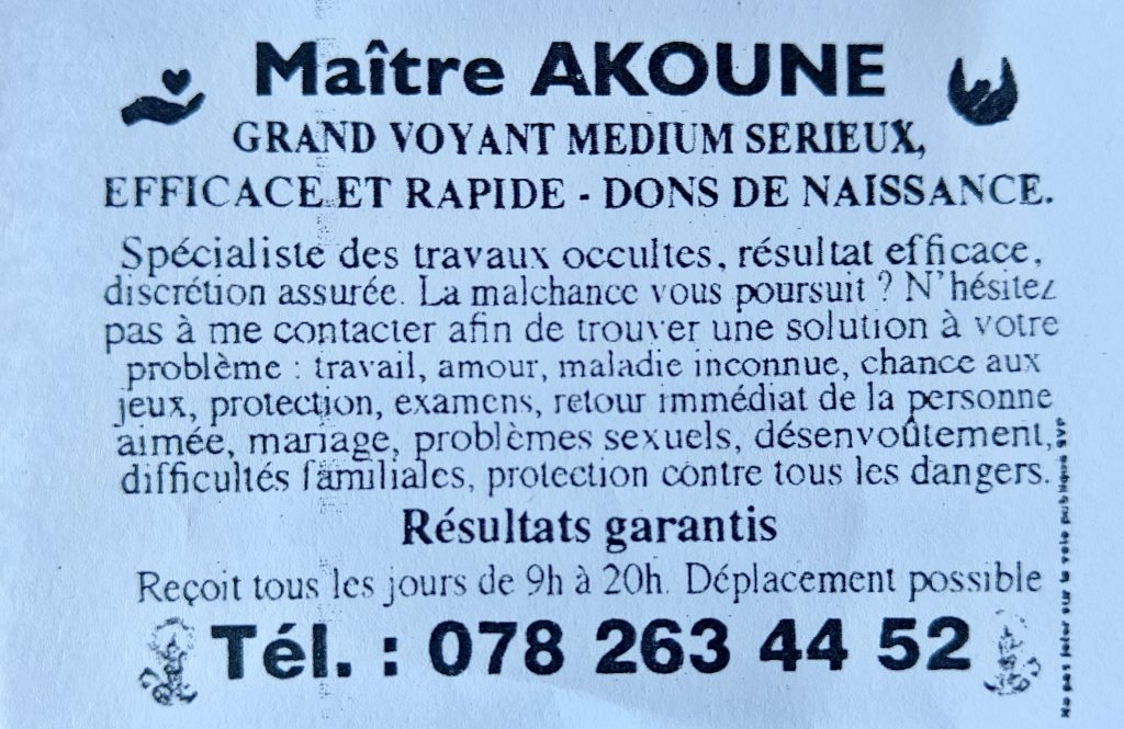 Des escrocs, très souvent d’origine guinéenne et domiciliés en France, enfilent ce costume de marabout et viennent sévir en Suisse romande. Ils proposent de nombreux services tarifiés2Voir les exemples d’affichettes ci-dessous. et ce parfois en échange d’un prêt d’une importante somme d’argent. Une fois que le prêt est remis, il n’est jamais retourné et le service demandé n’est jamais réalisé. Lors des rituels tarifiés, le marabout n’atteint jamais l’objectif attendu la première fois, un nouveau montant est alors demandé pour finaliser le rite. Ce processus se répète jusqu’au moment où la victime réalise la supercherie.
