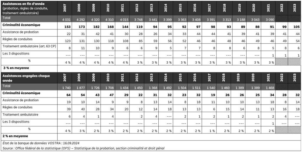 En raison de plusieurs limites méthodologique, la portée de ces résultats reste toutefois exploratoire. Tout d’abord, la sélection restreinte des infractions exclut une partie du Code pénal et les infractions qui relèvent d’autres lois fédérales. Les chiffres des dernières années sont encore provisoires en raison des procédures en appel et ceux de la récidive ne comptabilisent que les auteurs suisses. Ces résultats doivent donc être considérés comme les jalons de futures recherches qui permettraient, par exemple, de vérifier si cette proportion ne serait pas plus importante s’il l’on comptabilisait toutes les infractions à caractère économique ; si ces auteurs bénéficient d’un profil de « risque »17Comprendre « risque de récidive » dont les indicateurs comprennent principalement les antécédents, les actes de violence, la diversité de la carrière criminelle, la fréquentation de pairs déviants, une attitude favorable à la délinquance, des troubles de la personnalité, des addictions et des difficultés scolaires, professionnelles, familiales ou à structurer son temps libre. favorable ou des peines moins sévères qui les tiendraient davantage éloignés d’un suivi postpénal ; ou si l’assistance de probation était davantage perçue comme une aide sociale qu’un moyen de contrôle. Des études comparatives avec d’autres types de délits (trafic de stupéfiants, vols) offriraient des pistes d’analyses complémentaires s’agissant de la récidive. Finalement, il serait intéressant d’étudier comment sont concrètement mis en place le contrôle des règles de conduite ou d’une interdiction avec ce type d’auteurs.