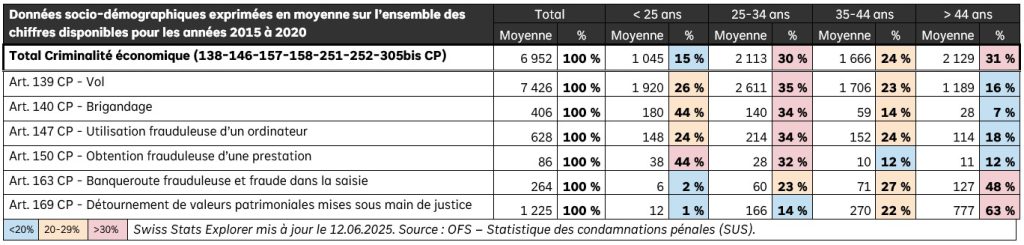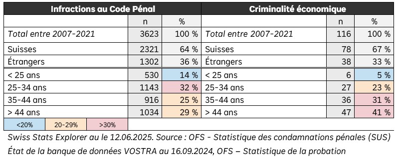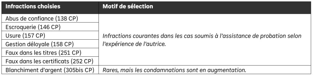 Il semble pourtant que les auteurs d’infractions économiques soient rarement soumis à de telles dispositions. Sur la base d’une sélection d’infractions (Tableau 1), il ressort des données de l’OFS (2007-2021) qu’ils représentent en moyenne 3 % des justiciables soumis à l’une de ces dispositions et 2 % de celles qui sont engagées chaque année, soit moins de 1 % du total de condamnés pour ces mêmes infractions (Tableau I, Tableau II, Tableau III, Annexes). Hélas, nous ne disposons pas des données concernant la mesure prévue à l’art. 67 CP pour ces auteurs.