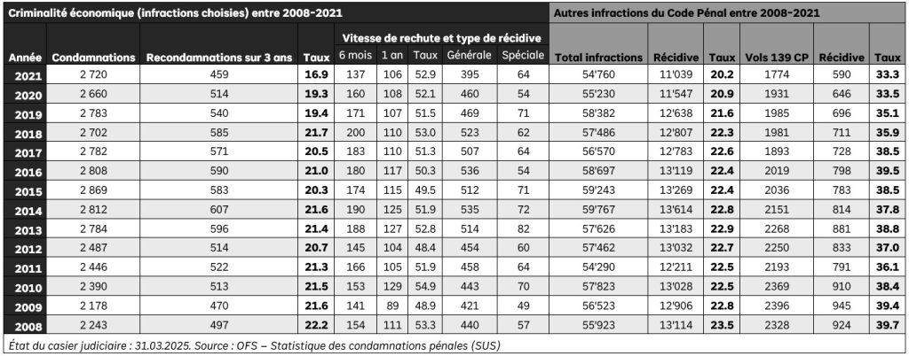 Concernant la récidive, les données relèvent qu’environ 20% des auteurs d’infractions économiques récidivent dans les 3 ans suivant leur dernière condamnation et que la moitié des recondamnations a lieu au cours de la 1e année (Tableau V, Annexes). Les statistiques indiquent qu’ils sont une minorité à être condamnés pour des infractions relevant de notre sélection (récidive spéciale). Il faut néanmoins rappeler que la criminalité économique ne se limite pas à cette liste d’infractions. Il ressort également que ce taux de récidive est peu ou prou équivalent à celui de la récidive générale. En revanche, ce taux est inférieur à celui des vols. L’une des explications pourrait être que les infractions économiques donnent lieu à des enquêtes et à des procédures plus longues et plus complexes.