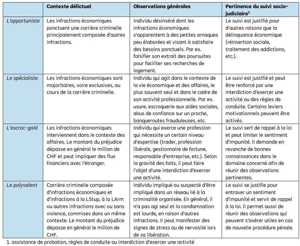 Venons-en, à présent au suivi probatoire des auteurs d’infractions économiques. Le premier constat est que cette criminalité est loin d’être une catégorie homogène. Elle est composée en réalité de plusieurs profils, ce qui peut s’avérer essentiel pour la prise en charge de ces individus. La typologie proposée au Tableau 2 met en évidence quatre profils. Selon cette classification, l’on constate que les opportunistes se rapprochent davantage d’une petite délinquance, plutôt marquée par des difficultés d’insertion sociale.