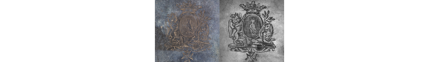 Fig. 1 : Impression visuelle sous 48 LEDs d’une armoirie sans modification des paramètres : le ternissement rend l’armoirie difficilement lisible (cliché à gauche) ; même impression visuelle avec nuances de gris et intensité matérielle élevée (cliché à droite) où les contours sont plus lisibles ©HE Arc CR Ra&D