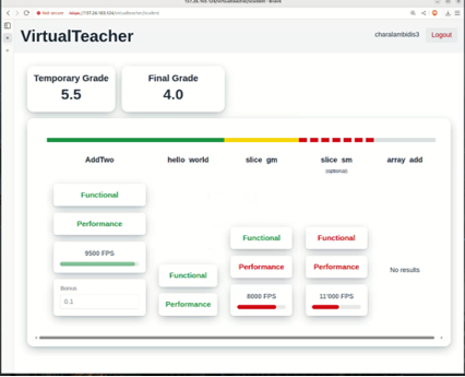 Durant le projet, le système permettant la compilation et l’exécution de manière sécurisée du travail des étudiants, d’évaluer la justesse de leurs travaux ainsi que leurs performances à l’aide de tests unitaires a été développé.