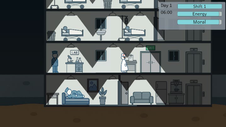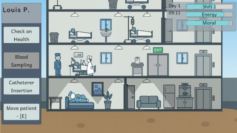 Un jeu de démonstration en 2D avec vue latérale a été créé à partir d’éléments générés et implémentés dans Unity. Il comprend des tâches de soins aux patients, une dégradation des performances due à la fatigue et des objectifs aléatoires sur plusieurs quarts de travail.