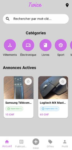 Ce travail de bachelor avait pour objectif le développement d’une application mobile baptisée Twice, destinée à faciliter la vente d’objets de seconde main entre particuliers en Suisse.