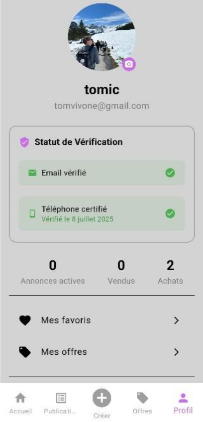 L’application propose un parcours utilisateur simple, sécurisé, et une assistance intelligente à la création d’annonces à partir de photos.